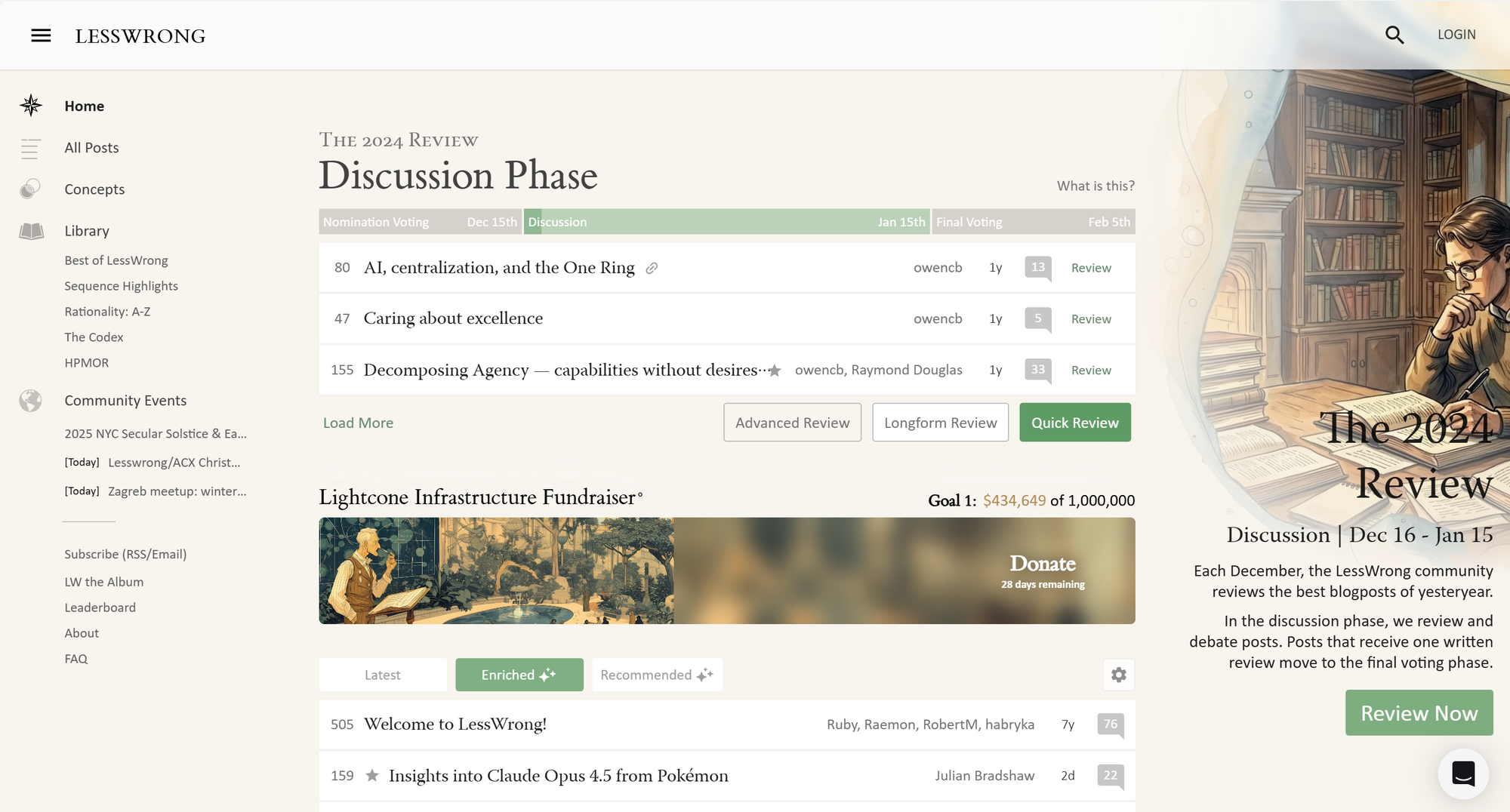 LessWrong은 확실히 더 세련된 디자인을 보여줍니다. 각 요소들의 세련된 배치와 멋있는 일러스트가 있고, 목록의 링크 위에 마우스를 올리면 글의 총 단어 수와 앞부분까지 미리 보여줍니다!
