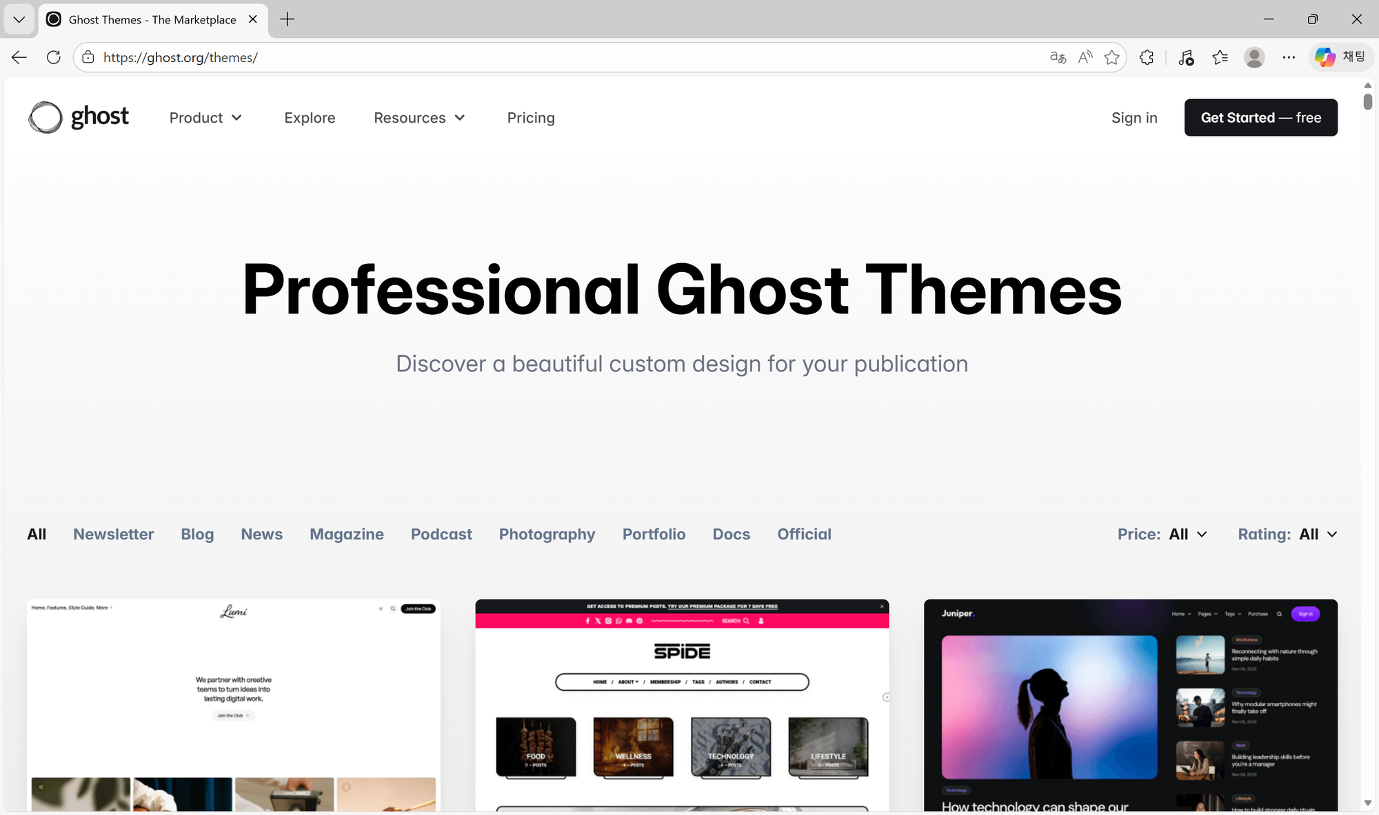 Ghost는 테마를 구매할 수 있는 마켓플레이스를 운영하고 있습니다. 유료 테마의 가격은 기본적으로 $99부터 시작하는데, 예상한 것에 비해 너무 비싸다고 생각했습니다.